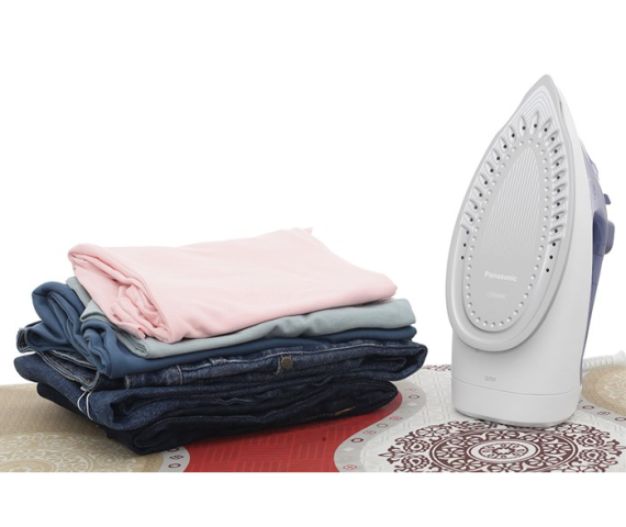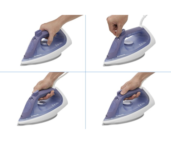 - Bàn ủi Panasonic gam màu sắc nhẹ nhàng đẹp mắt, thiết kế gọn gàng và hiện đại, khối lượng nhẹ 1.1 kg di chuyển thoải mái tay cầm khi là ủi, không gây mỏi tay.
