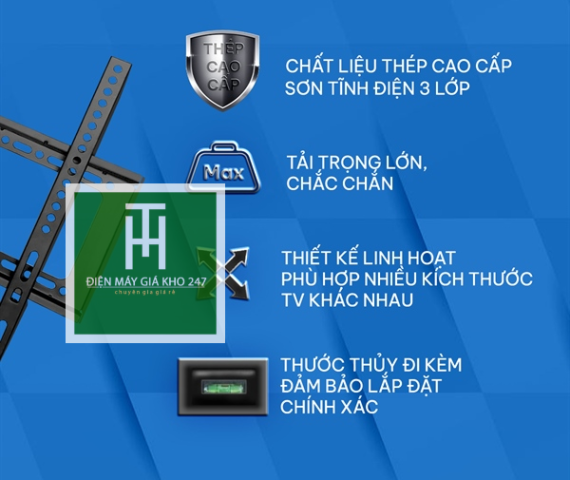 - Lắp đặt dễ dàng, có kèm theo thước thủy để đo lường chính xác, đảm bảo cân bằng khi lắp tivi lên tường.