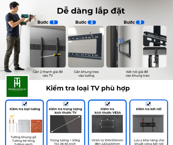 - Giá treo tivi loại cố định lắp ráp dễ dàng, có hướng dẫn lắp chi tiết.