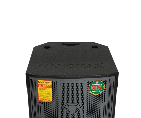 Mặt trên loa có in tên thương hiệu Nanomax trực tiếp lên mặt thùng, đồng thời cũng được bố trí thêm hai lỗ tròn để giữ micro đứng thẳng trong quá trình bạn sử dụng.