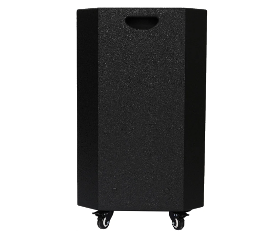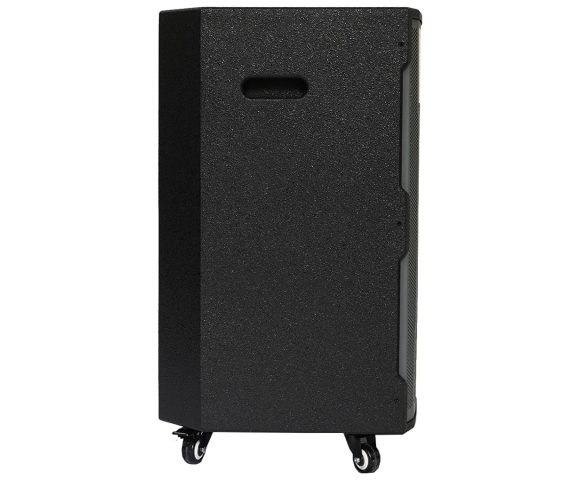 Để tăng khả năng linh hoạt trong quá trình sử dụng loa, hãng Nanomax đã tích hợp cho loa 4 bánh xe bên dưới và thêm hai tay xách dạng lõm ở hai mặt bên. Nhờ đó, người dùng cũng dễ dàng di chuyển thiết bị đến nhiều vị trí bất kể địa hình. Mặt bên cũng là nơi trang bị hệ thống nút điều chỉnh, màn hình LED và cổng kết nối để người dùng thiết lập và sử dụng.