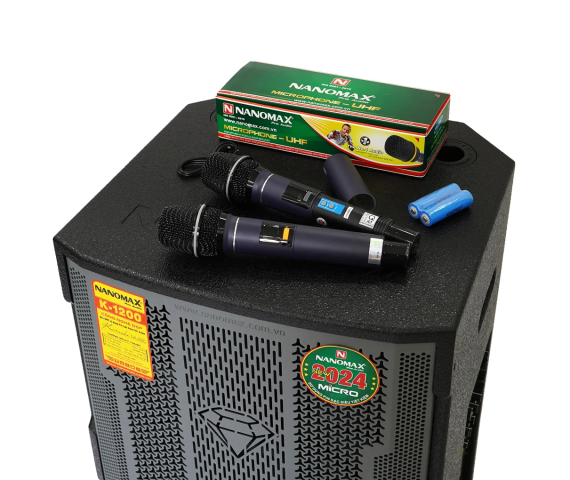 Loa Nanomax K-1200 đi kèm đôi micro không dây sử dụng sóng UHF hiện đại. Bank tần UHF không chỉ giúp micro hoạt động trơn tru, hạn chế hiệu quả hiện tượng trùng sóng âm mà còn giúp thiết bị siêu tiết kiệm pin khi sử dụng (thời gian sử dụng có thể kéo dài từ 5 đến 7 ngày). Với đôi micro pin sạc này, bạn không cần mua những viên pin tiểu nữa, điều này cũng giúp bảo vệ môi trường hiệu quả vì hạn chế thải ra môi trường viên pin dùng 1 lần.