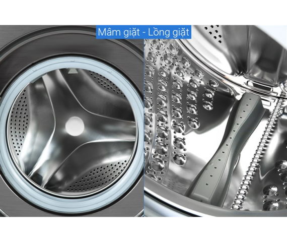 - Lồng giặt được hoàn thiện bằng chất liệu thép không gỉ cho hiệu quả bền bỉ và hạn chế vi khuẩn, chất liệu này thường được sử dụng trong các vật dụng chế biến thức ăn.