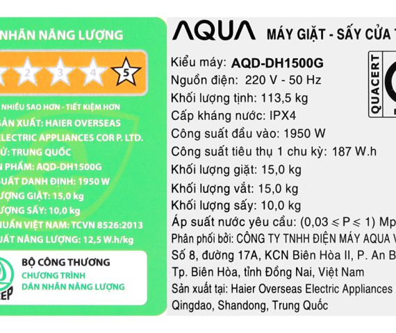 - Có nhãn năng lượng tiêu chuẩn 5 sao, hiệu suất sử dụng điện là 12.5 Wh/kg.