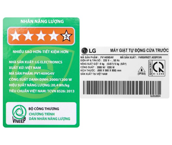 - Chiếc máy giặt LG FV1409G4V được tích hợp giặt sấy 2 trong 1 khi đạt khối lượng giặt 9 kg và khối lượng sấy đến 5 kg, phù hợp cho những hộ gia đình từ 3 - 5 người hoặc gia đình ít thành viên hơn nhưng lại có nhu cầu vừa giặt hay sấy với số lượng quần áo nhiều trong mỗi lần giặt giũ, nhất là tiết kiệm thời gian làm khô quần áo trong những ngày trời mưa ẩm ướt.