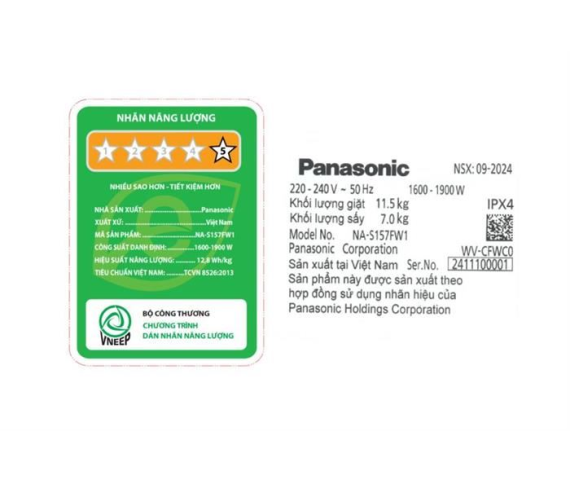 Máy giặt sấy Panasonic Inverter 11.5 kg - 7 kg NA-S157FW1BV là lựa chọn lý tưởng cho gia đình hiện đại cần một thiết bị giặt giũ linh hoạt, tiết kiệm thời gian và bảo vệ sức khỏe. Với khả năng giặt sấy 2 trong 1, công nghệ UV Blue Ag+ diệt khuẩn nước lạnh, hệ thống AutoDose thông minh và loạt tiện ích tiện nghi, sản phẩm mang đến trải nghiệm giặt giũ cao cấp, bền bỉ và đáng tin cậy cho cuộc sống bận rộn.