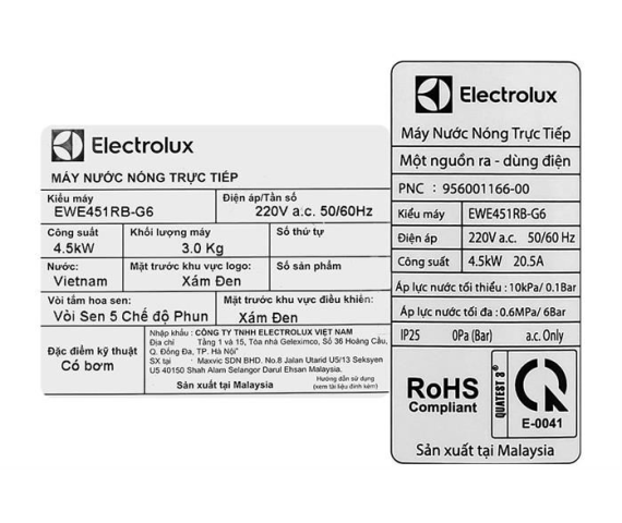 - Máy nước nóng trực tiếp Electrolux 4500W EWE451RB-G6 được thiết kế sang trọng, kiểu dáng đơn giản phong cách hiện đại. Máy mang sắc đen chủ đạo bắt mắt, dễ bố trí cho nhiều không gian phòng tắm.
