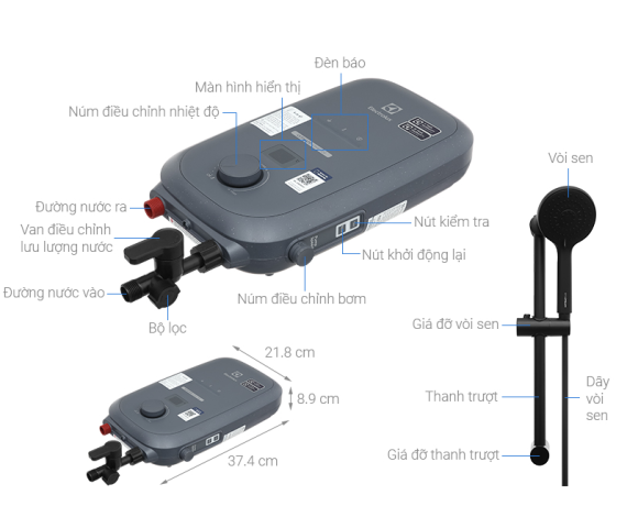 - Máy nước nóng trực tiếp có công suất 4500W kèm vòi sen 5 chế độ phun.