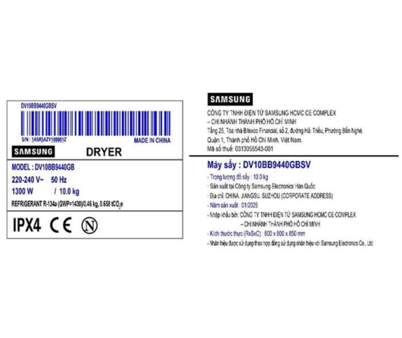 - Máy sấy Samsung DV10BB9440GBSV thuộc dòng máy sấy bơm nhiệt, vận hành hiệu quả và tiết kiệm năng lượng.