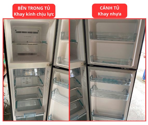 Tủ lạnh thiết kế các khay kệ kính chịu lực tốt, chắc chắn, đáp ứng tốt nhu cầu bảo quản nhiều loại thực phẩm có kích thước, trọng lượng khác nhau. Khay kính cũng dễ dàng hơn khi vệ sinh, làm sạch.
