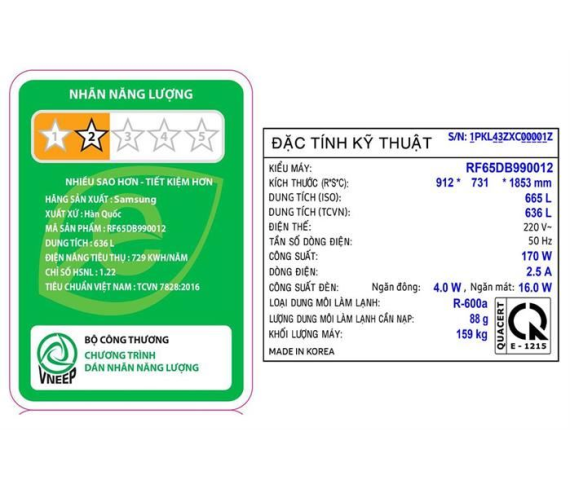 - Tủ lạnh Samsung dung tích 636 lít, phù hợp nhu cầu lưu trữ thực phẩm cho gia đình trên 5 thành viên.